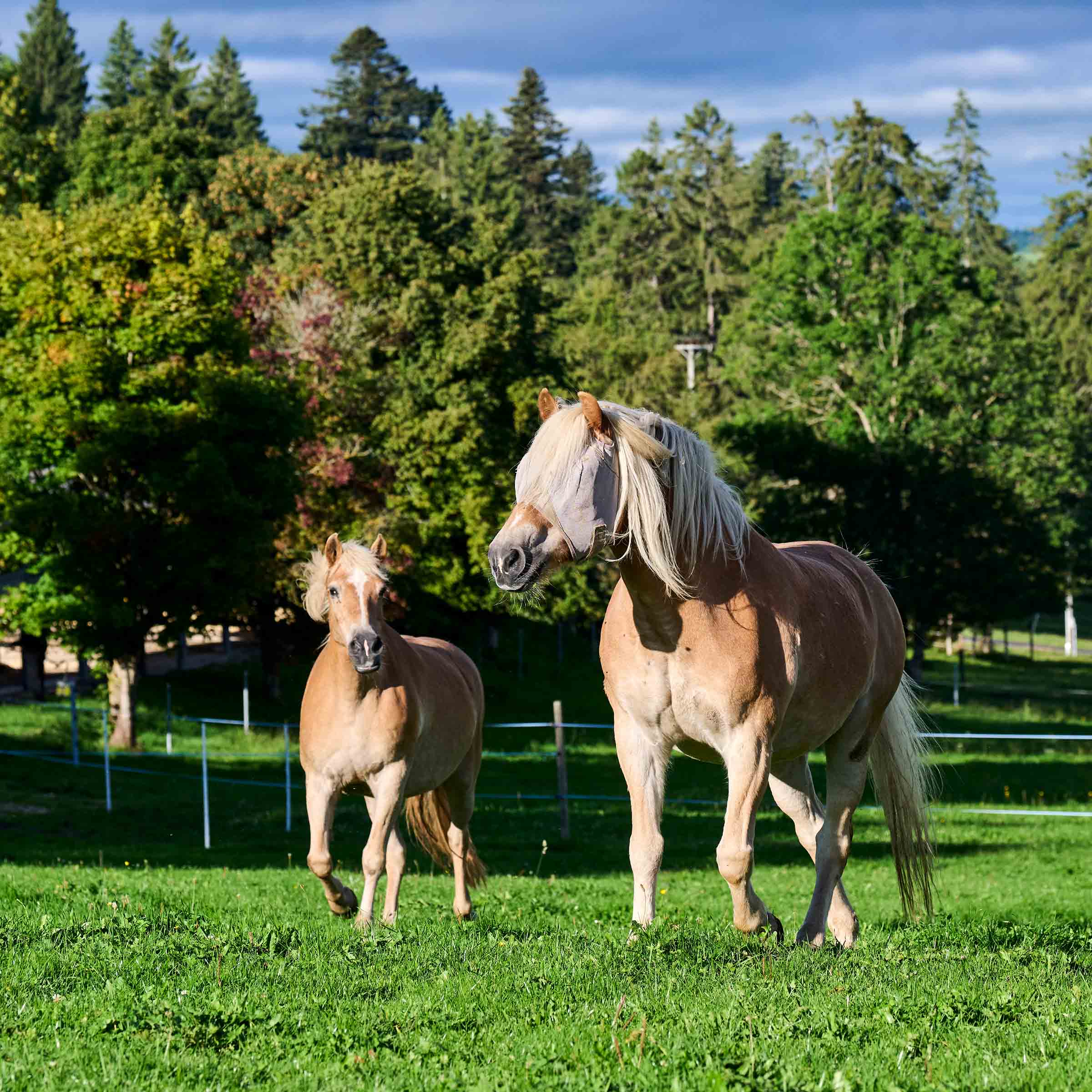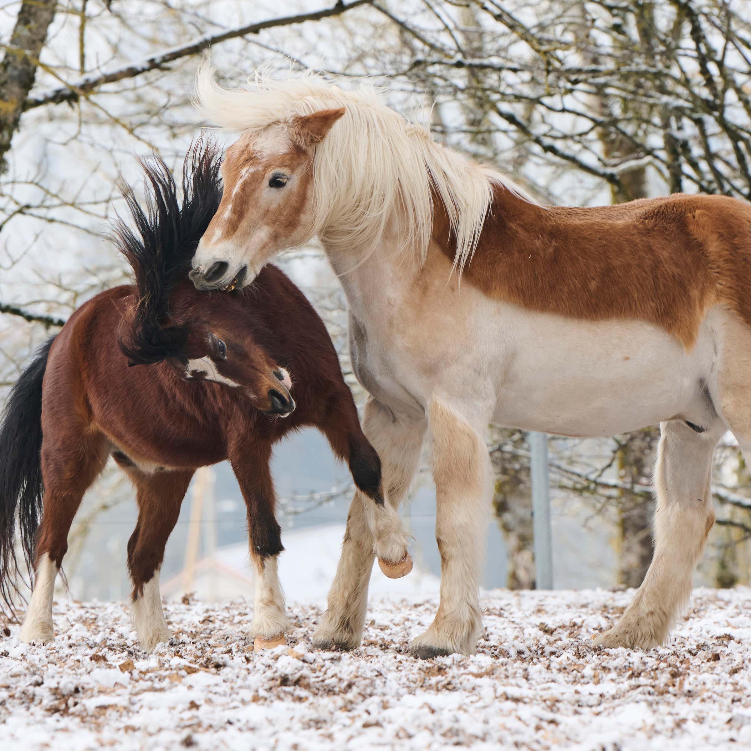 Aladin verdankt sein Name seinen letzten Besitzern, welchen sein ursprünglicher Name „Albert“ nicht gefiel. Dieser wunderschöne Haflinger wurde in Holland geboren. Dort wurde er als Zuchthengst anerkannt. Der schöne Aladin, zu diesem Zeitpunkt bereits Wallach, wurde 2007 von einem Berner Reitzentrum gekauft. Angespannt an der Seite von Nardina, ebenfalls Haflinger, gewann Albert auf nationaler und internationaler Ebene zahlreiche Titel im Fahrsport. Er ist vielseitig und nahm auch an Dressurprüfungen teil. Seine Besitzer wollten Albert einen ruhigen Ruhestand auf weitläufigen Weiden ermöglichen, sofern Nardina, seine treue Begleiterin seit 15 Jahren, ihn begleiten konnte. So kam es, dass die Stiftung für das Pferd die beiden im Herbst 2023 in Le Roselet aufnahm.