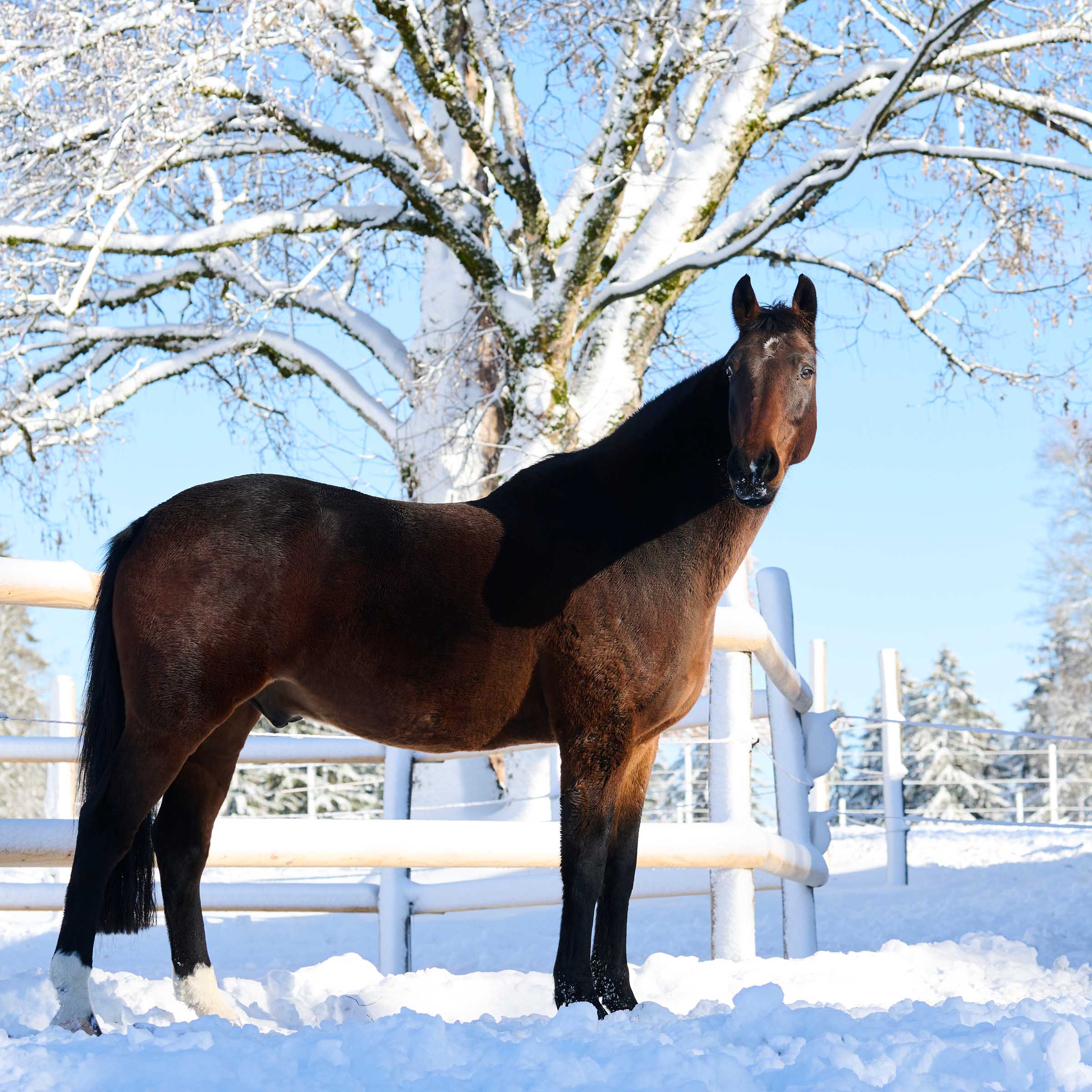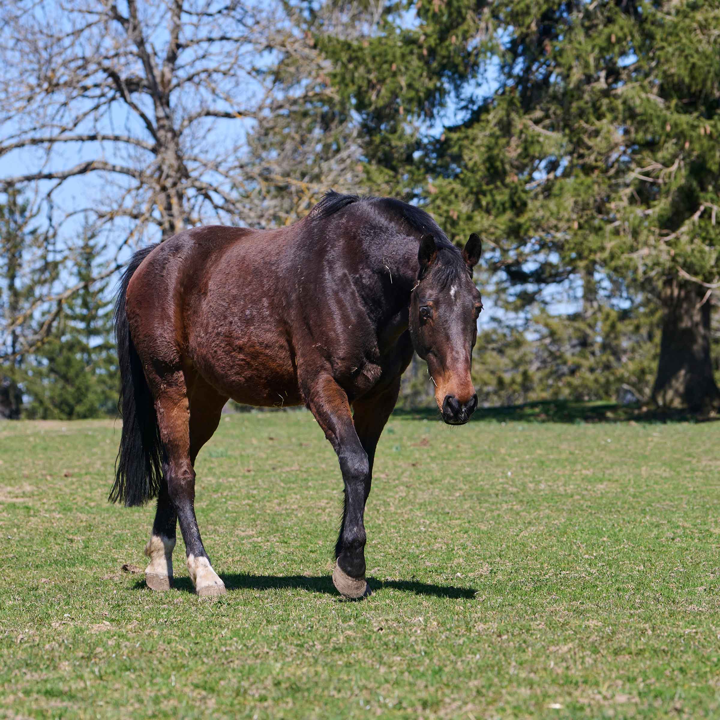 kleiner weisser Stern auf Stirn und dünner weisser Strich auf Nüstern; drei weisse Füsse (ausser vorne rechts)