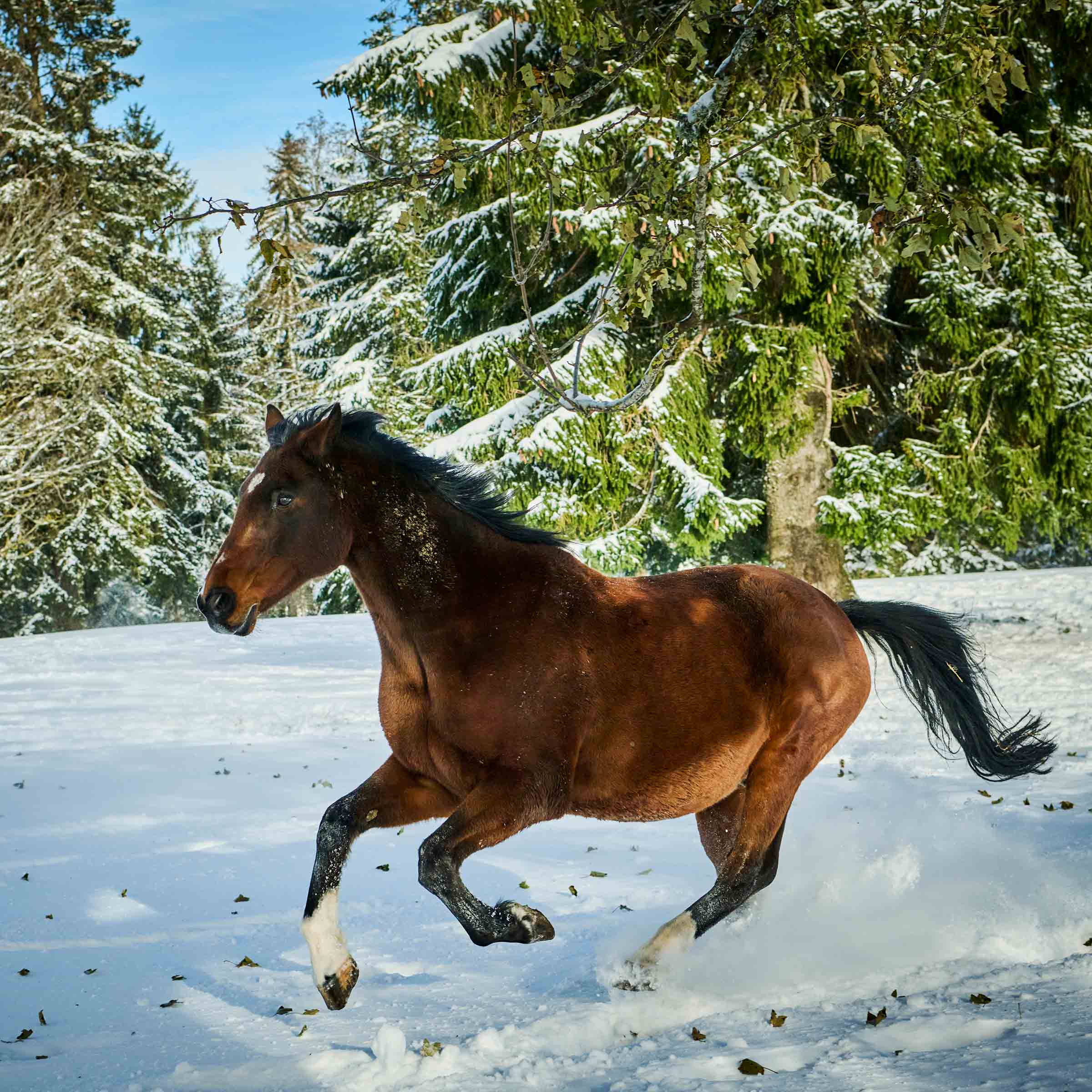 kleiner weisser Fleck auf der Stirn und den Nüstern; drei weisse Füsse (ausser hinten rechts)