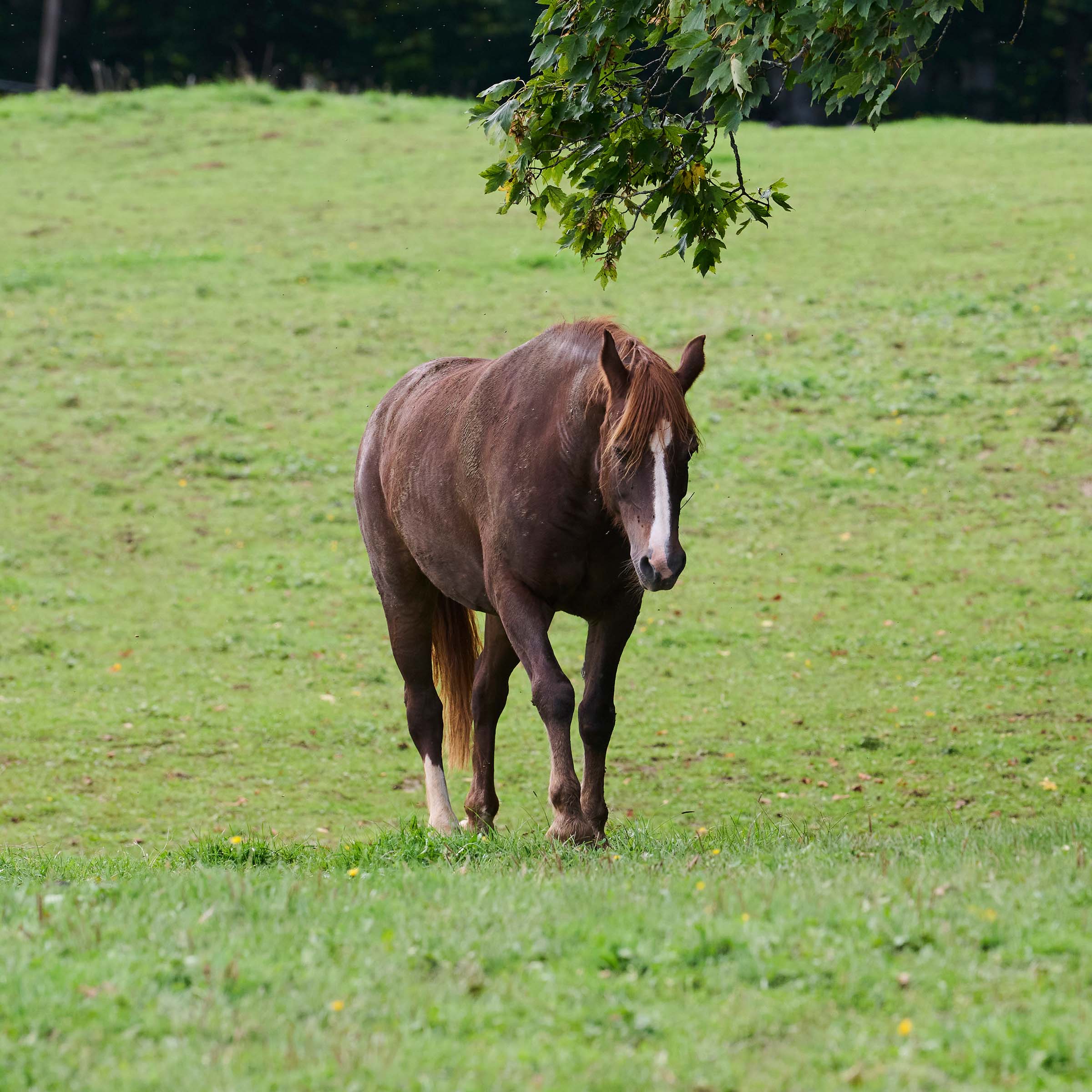 weisse Blesse bis über die Nüstern; rechter Hinterfuss weiss