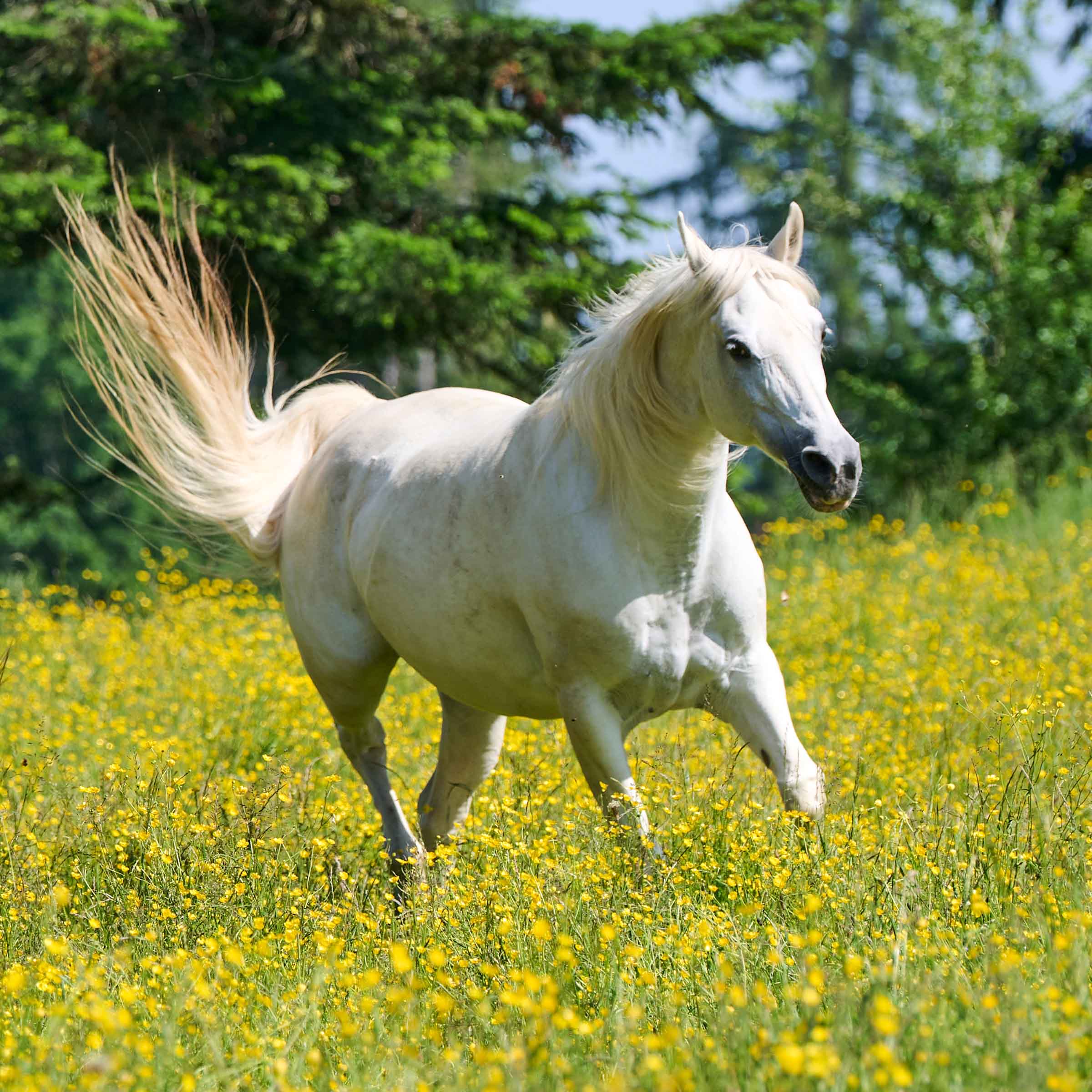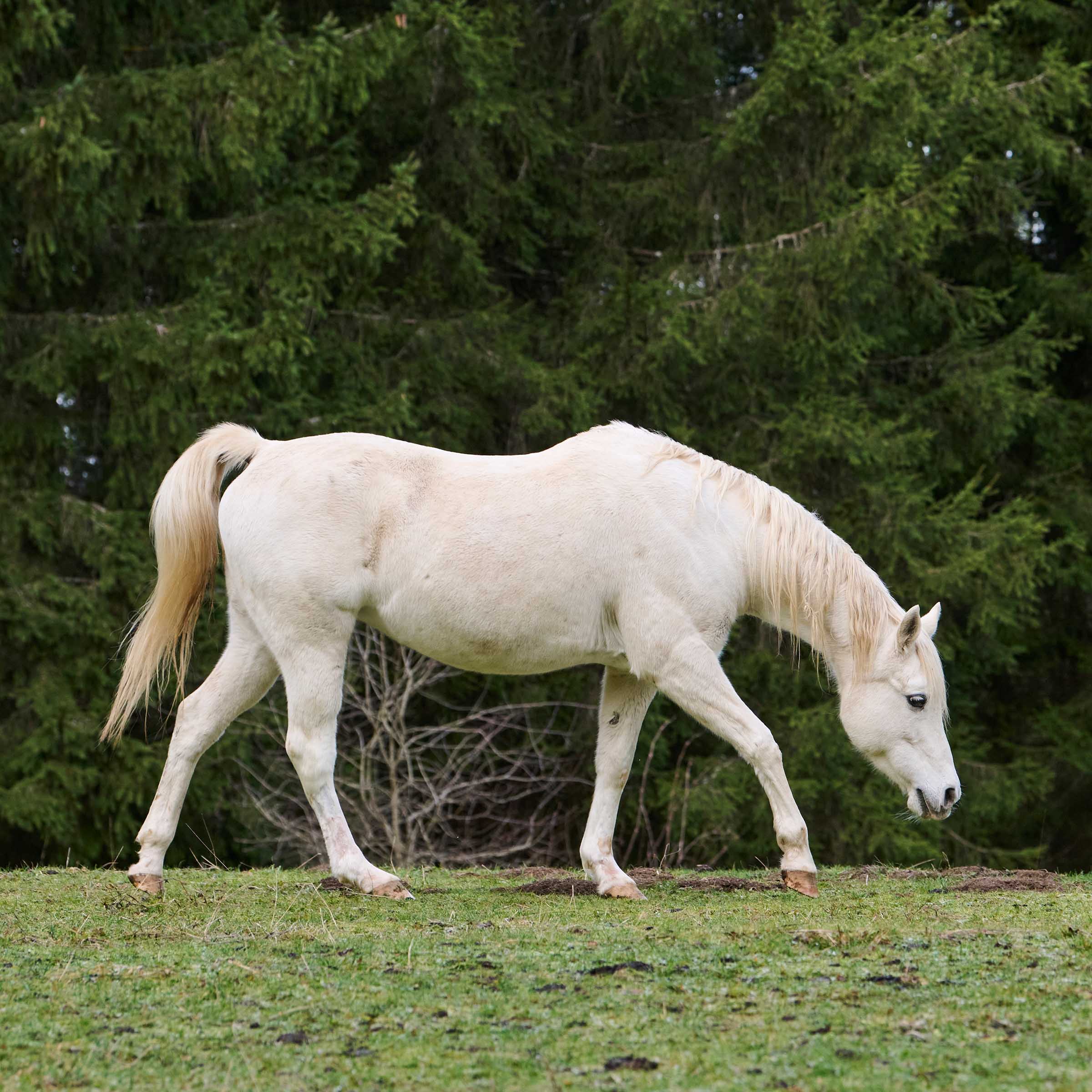 In Polen geboren, führte Goldis Lebensweg sie schon früh in die Schweiz. Als Jungpferd wurde sie sowohl in der Zucht als auch als Reitpferd eingesetzt, bis sie im Alter von sieben Jahren zu ihren letzten Besitzern kam. Dort lebte sie mit zwei weiteren Stuten, bewohnte eine Auslaufbox und wurde regelmässig geritten. Seit 2019 genoss Goldi den Vorruhestand und wurde aus Alters- und Gesundheitsgründen ihrer Besitzer nicht mehr gesattelt. Da sie wohl in ihrer Fohlenzeit ohne Herdenverbund keine ausreichende Sozialisierung erfahren hatte, entwickelte sie Ängste vor Feuerwerk und Gewitter. Ihre Besitzer, beide bereits im Rentenalter, meldeten Goldi und Estelia bei der Stiftung für das Pferd an. So konnten die beiden Araberstuten im Mai 2025 gemeinsam nach Les Murs ziehen.