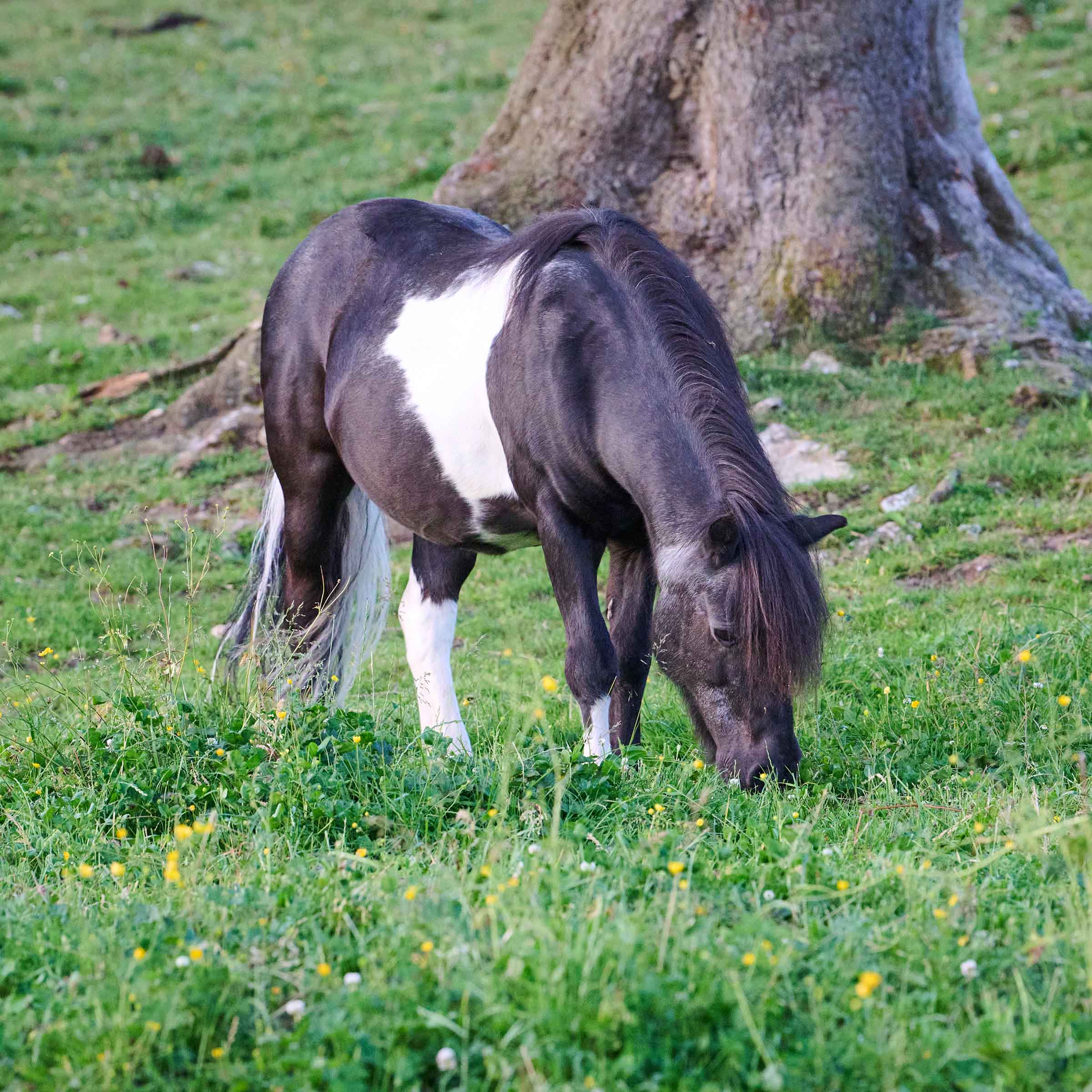 Henrys richtiger Name ist beeindruckend: Hero of Baltic Sea, also Held der Ostsee! Wahrscheinlich weil er auf der Halbinsel Holnis in Norddeutschland geboren wurde. Dieses elegante Shetlandpony mit edler Abstammung und schwarz-weiss geflecktem Fell wurde als Fohlen prämiert, bevor er später als Zuchthengst anerkannt wurde. Im Jahre 2010 kam Hero in die Schweiz, wo er ebenfalls im Zuchtbuch eingetragen wurde. Wir wissen nicht, wann und warum dieser hübsche, gescheckte Kerl kastriert wurde. Vielleicht, um am Leben der Herde teilzuhaben, deren Anführer er war? Seine letzte Besitzerin nannte den Wallach fortan Henry und hat ihn auch unter diesem Namen bei uns angemeldet, um ihm einen schönen Lebensabend zu bieten. Der selbstbewusste Schecke hat sich in Le Roselet gut eingelebt, obwohl er anfangs von den viel kleineren Shettys gejagt wurde. Er ist kerngesund und sticht mit seinem hübschen Fell aus der Herde heraus.