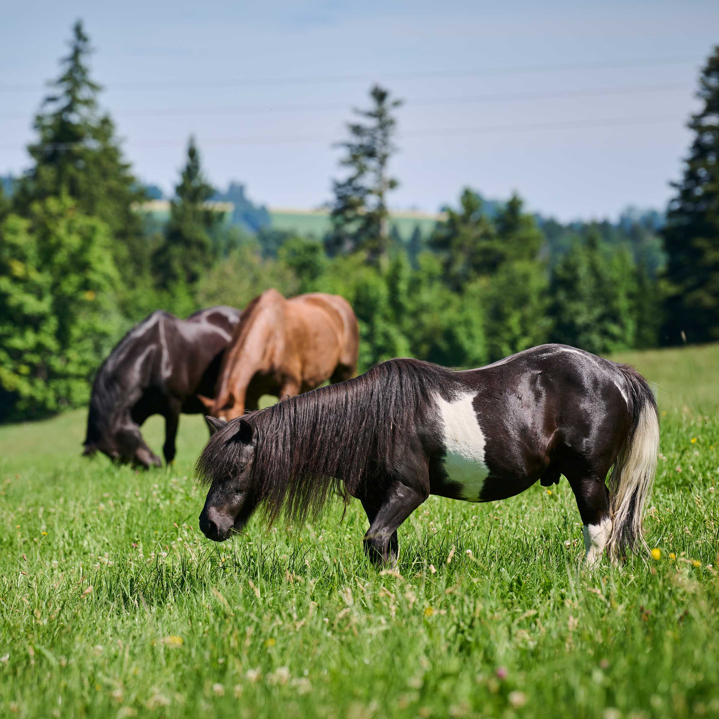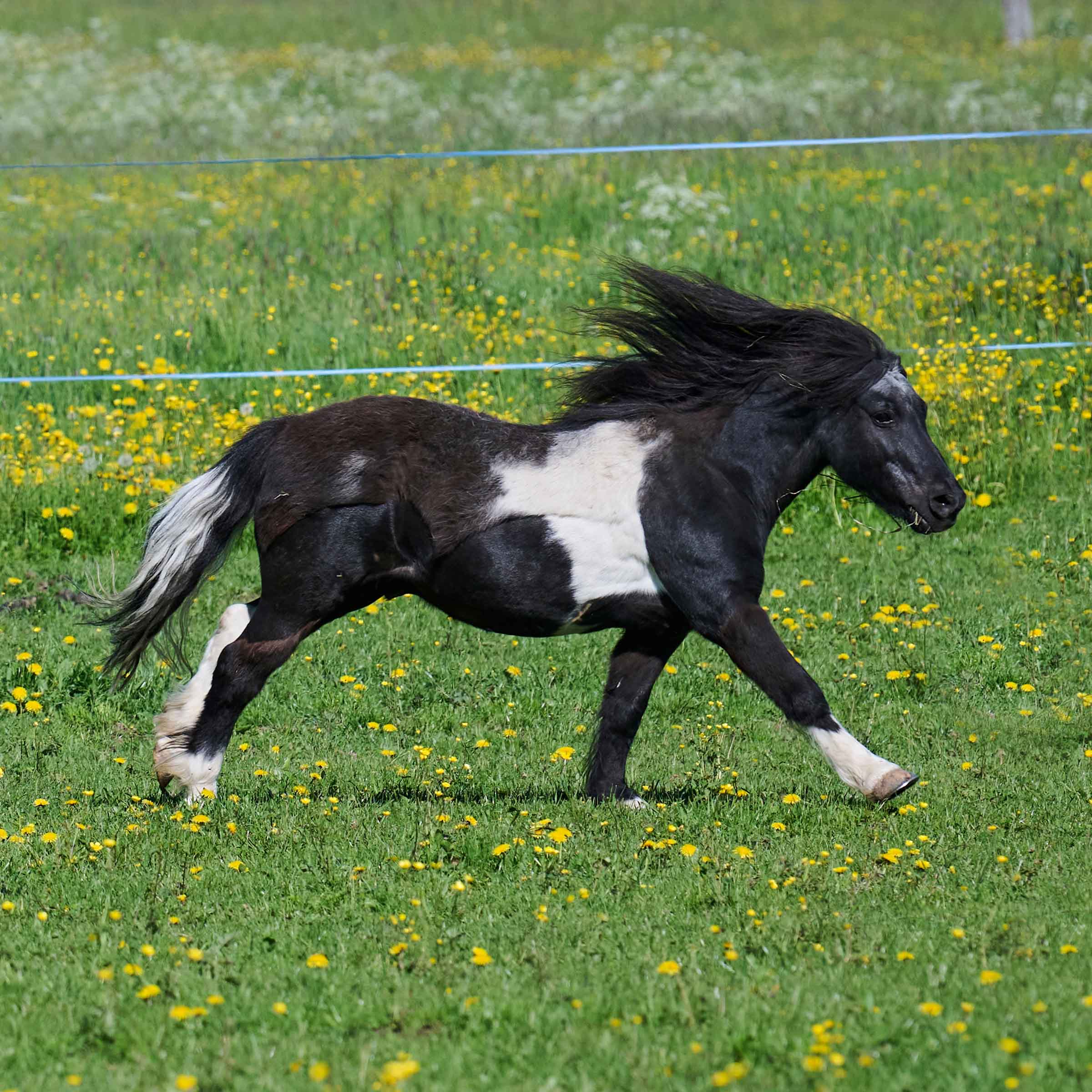 schwarz-weiss gescheckt; Mähne schwarz und Schweif schwarz-weiss