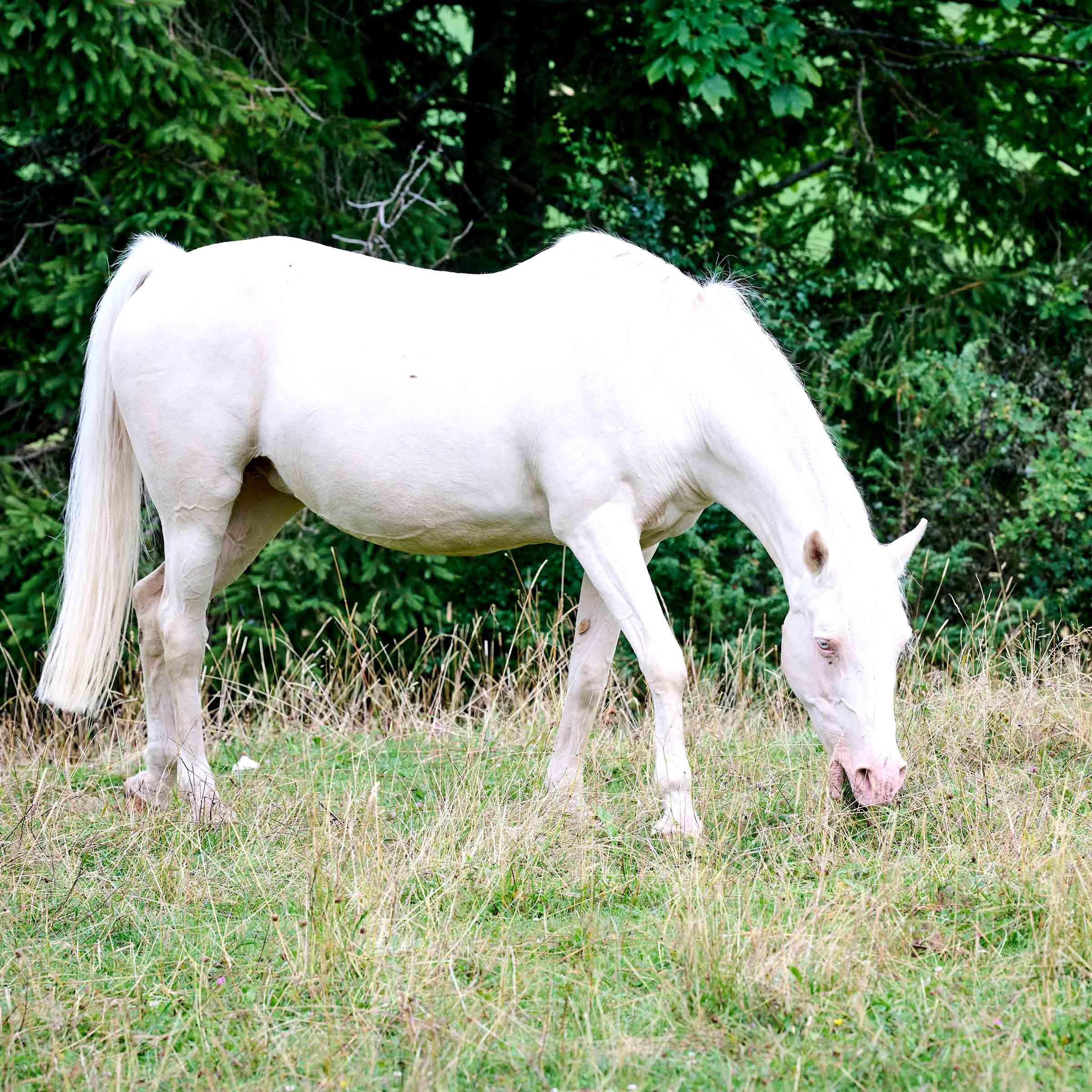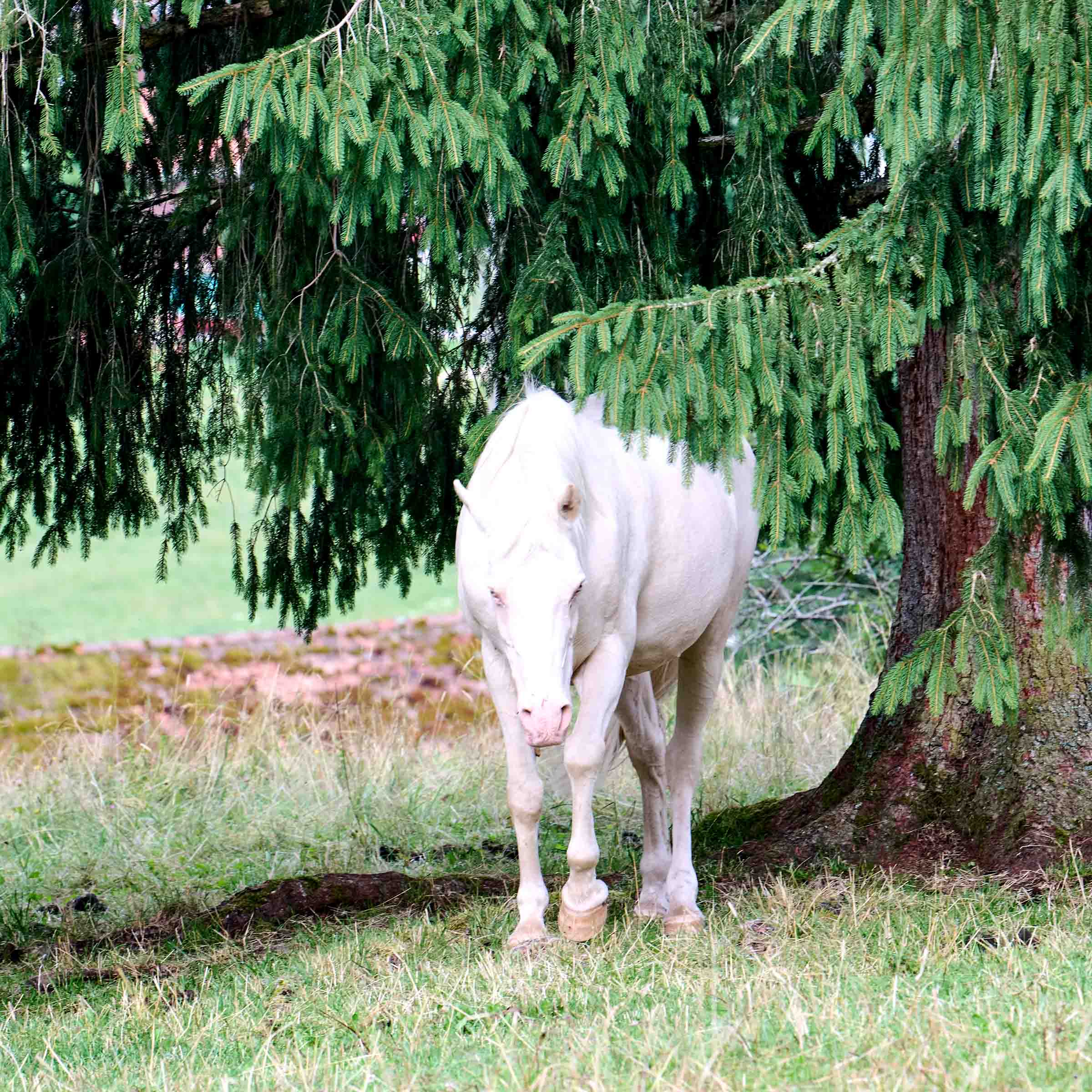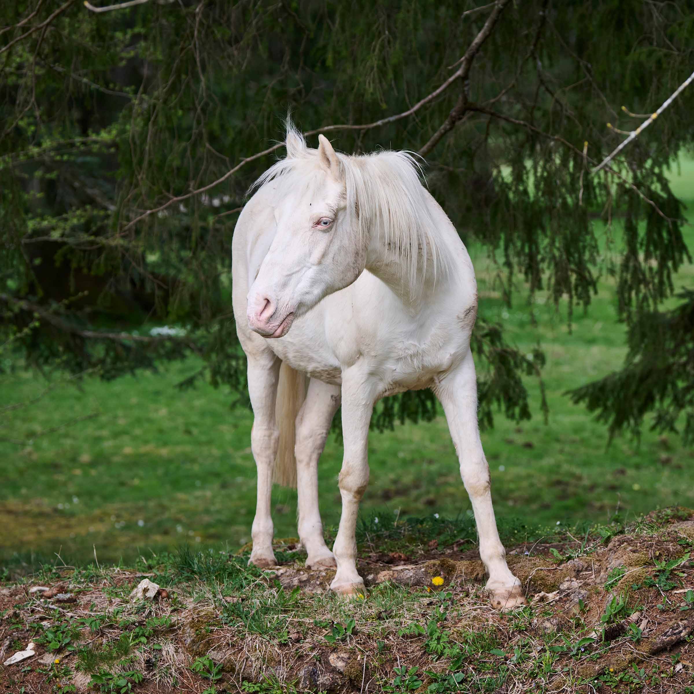 Die in der Schweiz geborene Kahina wurde im Alter von drei Monaten an eine pferdebegeisterte Frau verschenkt. Pferde mit dieser besonderen Fellfarbe, die Cremello (Creme) genannt wird, haben immer blaue Augen sowie eine rosafarbene Haut. Die ruhige und ausgeglichene Stute war angenehm zu reiten, auch ohne Sattel und ohne Gebiss. Da ihre Besitzerin sie nicht mehr behalten konnte, wandte sie sich an unsere Stiftung, um ihre bereits über 20 Jahre alte Stute zu platzieren. Kahina zog am 3. Oktober 2022 nach Les Murs. Wird sie von einem Artgenossen belästigt, zeigt sie ihr eindrückliches Repertoire: macht viel Lärm, ist aber nicht aggressiv. Kahina ist sehr nett, aber mag es nicht, gebürstet oder angefasst zu werden.