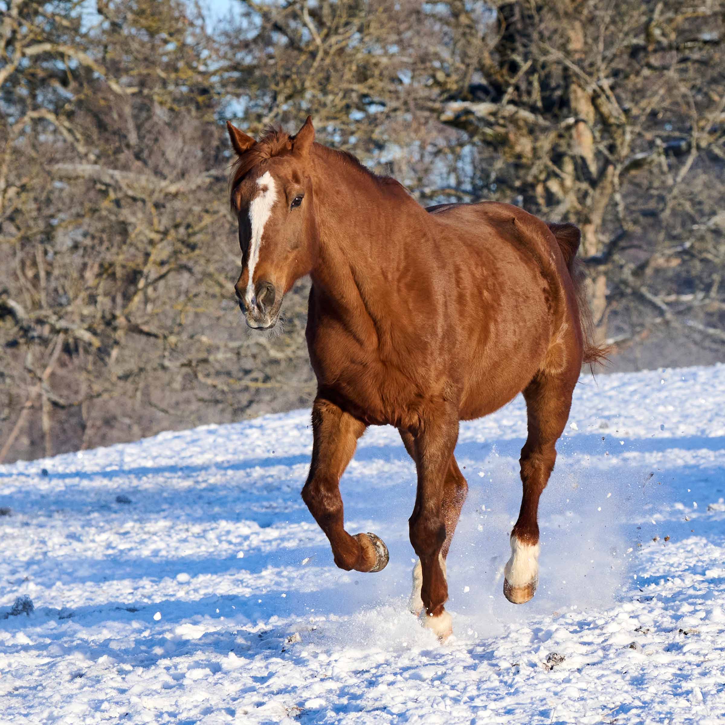 schmale Blesse bis über die Nüstern; drei weisse Füsse (ausser vorne rechts)