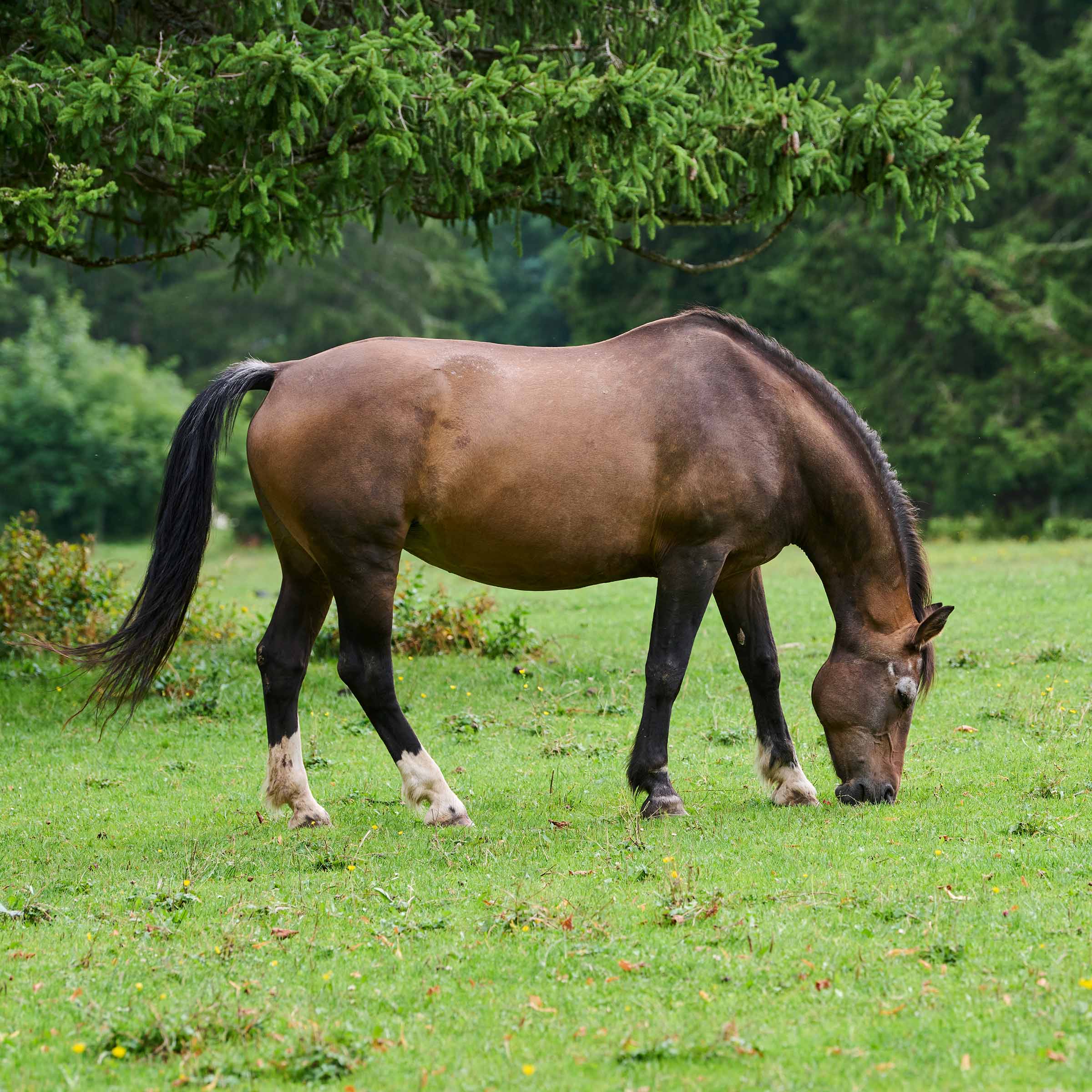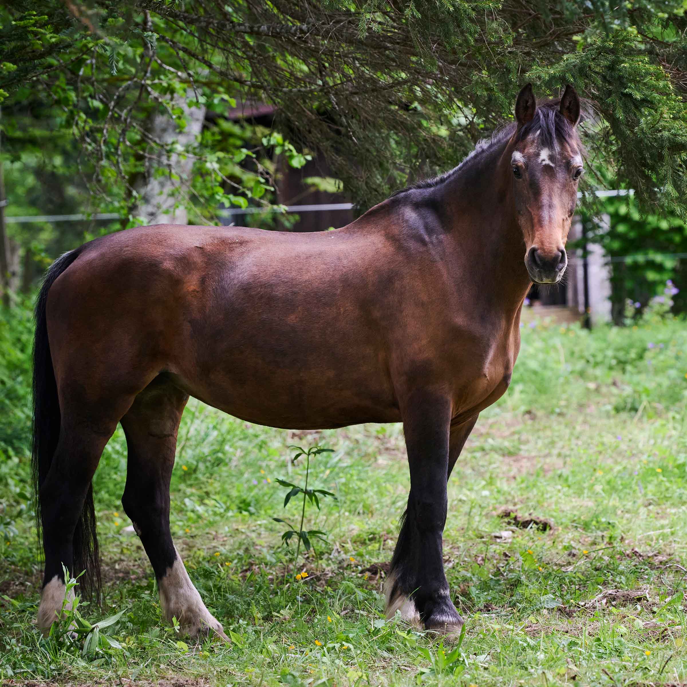 weisser Stern auf der Stirn sowie graue haare über den Augenbögen; drei weiss Füsse (ausser vorne rechts)
