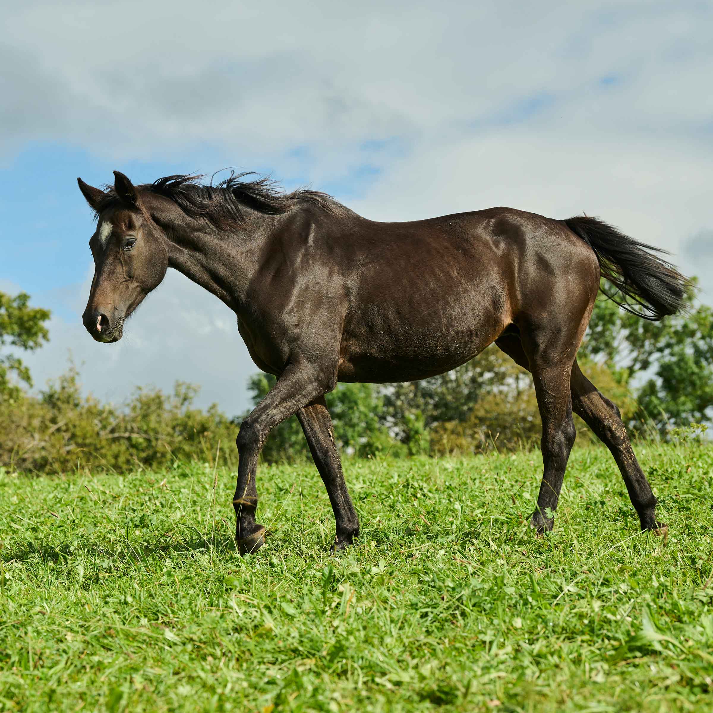 Dunkelbraun, scheint aber fast schwarz; Weissabzeichen am Kopf; linker Hinterfuss weiss