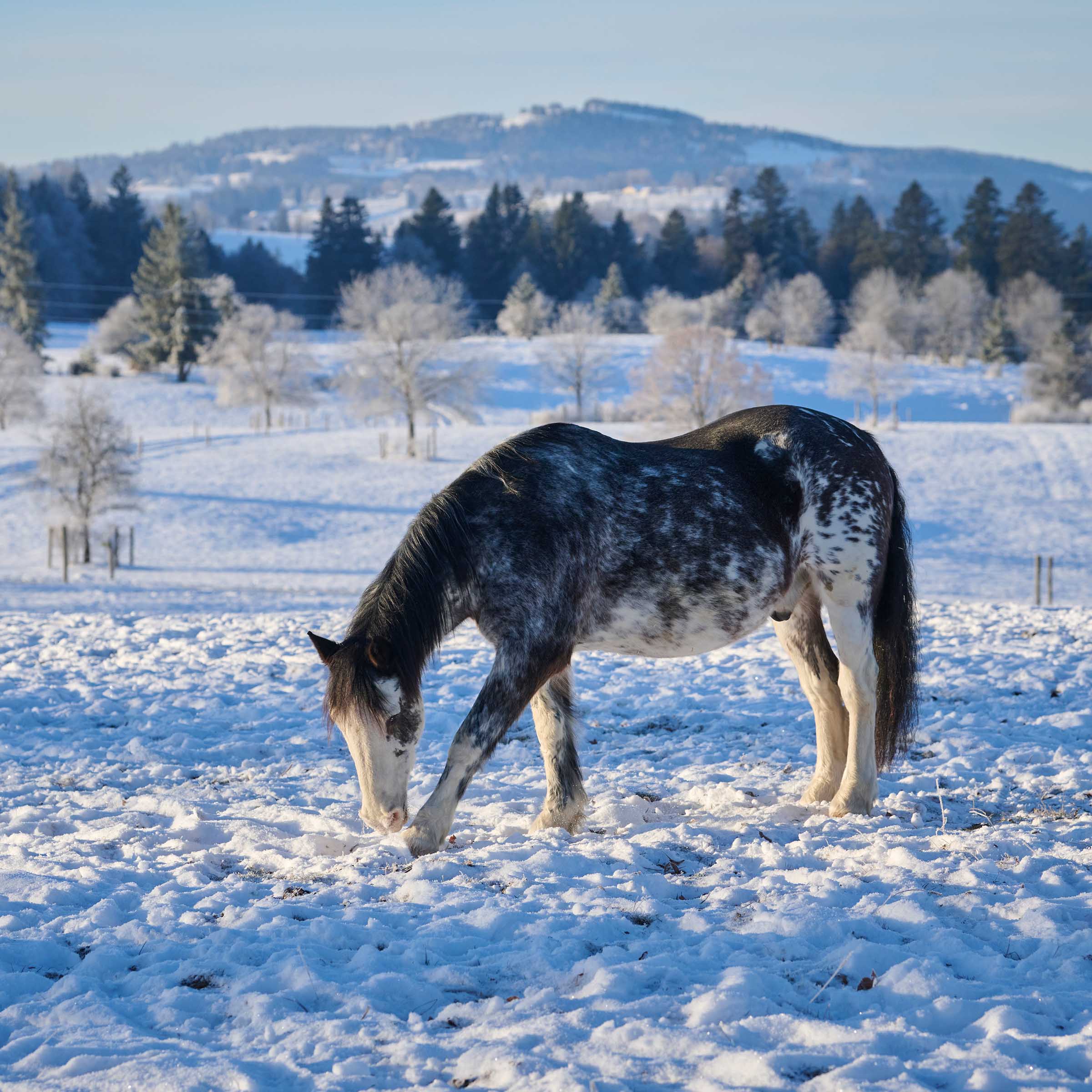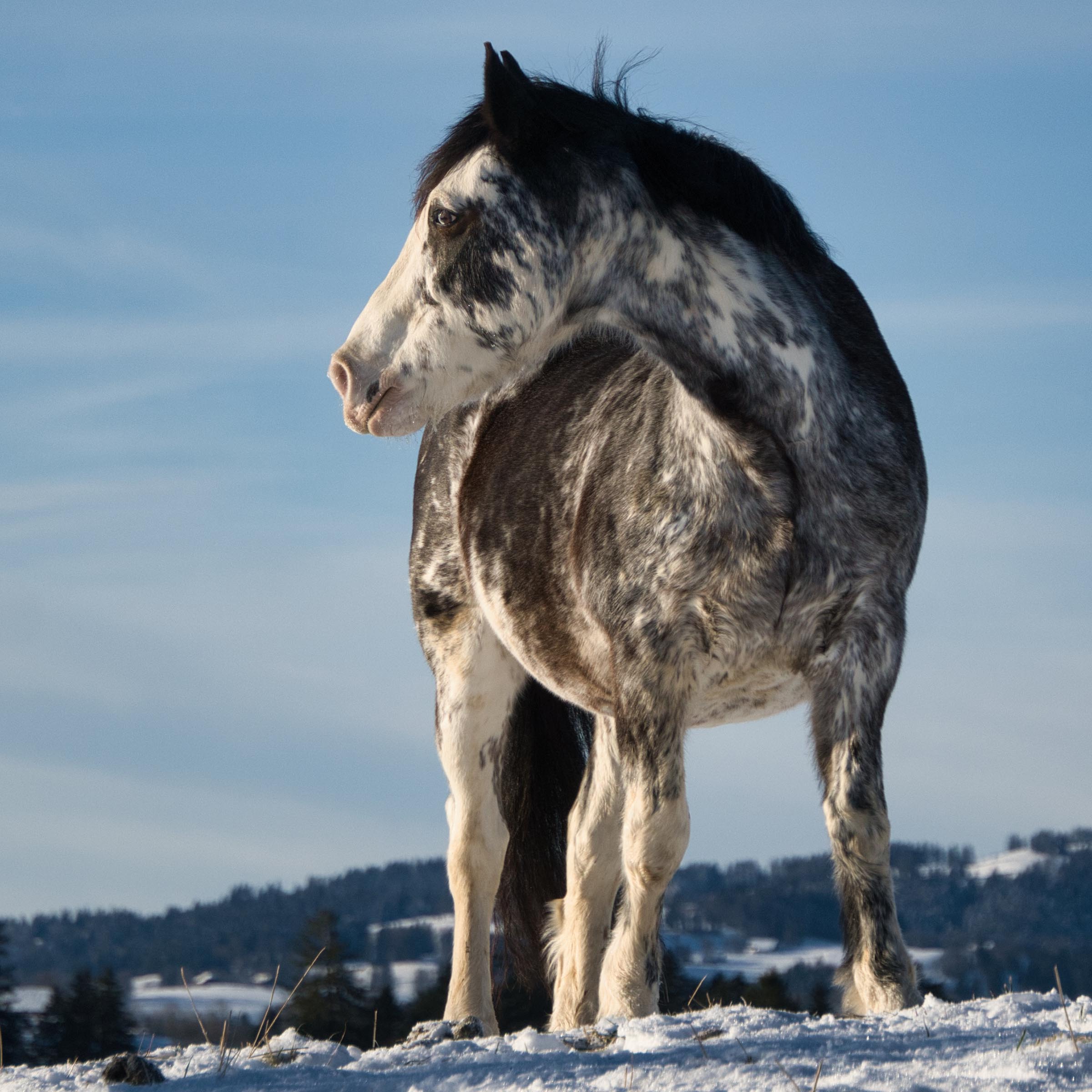 Dieser prächtige Criollo ist in Argentinien geboren, wo sein sehr seltenes und auffälliges Fell «Manchadolampa» genannt wird. Wir vermuten, dass dieses Pferd per Schiff nach Italien kam um dort geschlachtet zu werden. Sein Charisma und seine Farbe retteten ihn und seine letzte Besitzerin entdeckte ihn auf einer Ranch im Waadtland. Picasso liebte die Ausritte und kein noch so unwegsames Gelände hielt diesen sehr zuverlässigen, mit viel Kraft und Willensstärke ausgestatteten Wallach auf. Mit Arthrose konfrontiert, wurde Picasso bei uns angemeldet und kam im Januar 2021 in unserer Stiftung an. Von den anderen nicht besonders gemocht, vielleicht wegen seiner besonderen Fellfarbe, hat Picasso tapfer gekämpft, um seinen Platz in der Herde zu behaupten. Und wenn es ums Essen geht, macht ihm nichts mehr Angst.