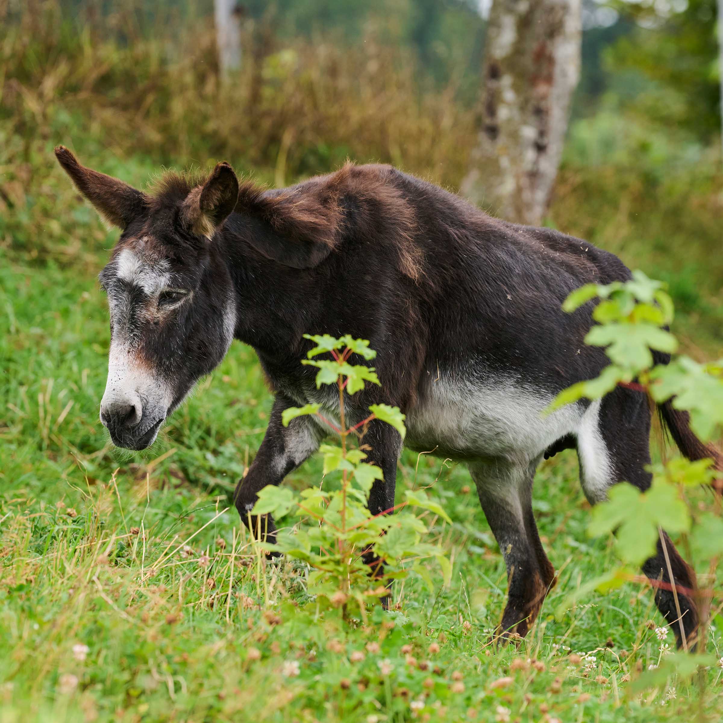 Diese Eselin, dessen Geburtsjahr auf 1993 geschätzt wird, lebte in einer Stiftung für Menschen mit kognitiven Defiziten, wo sie keine besonderen Aufgaben zu erfüllen hatte, ausser sich pflegen und spazieren führen zu lassen. Die Person, welche unsere Stiftung kontaktierte, um Sara, die bereits das Rentenalter erreicht hatte, zu platzieren, kannte sie nicht wirklich. Sie teilte uns lediglich mit, dass Sara an Sommerekzem leidet. Tatsächlich war das Fell von Sara, als sie am 31. Oktober 2023 zu uns kam, stark von dieser Krankheit gezeichnet, insbesondere ihre Beine. Da die kleine Dame trotz ihres guten Appetits sehr dünn ist, bekommt sie zusätzliche Futterrationen. Sie ist eine sehr freundliche und unkomplizierte Eselin, die sich gut mit ihren Artgenossen versteht.