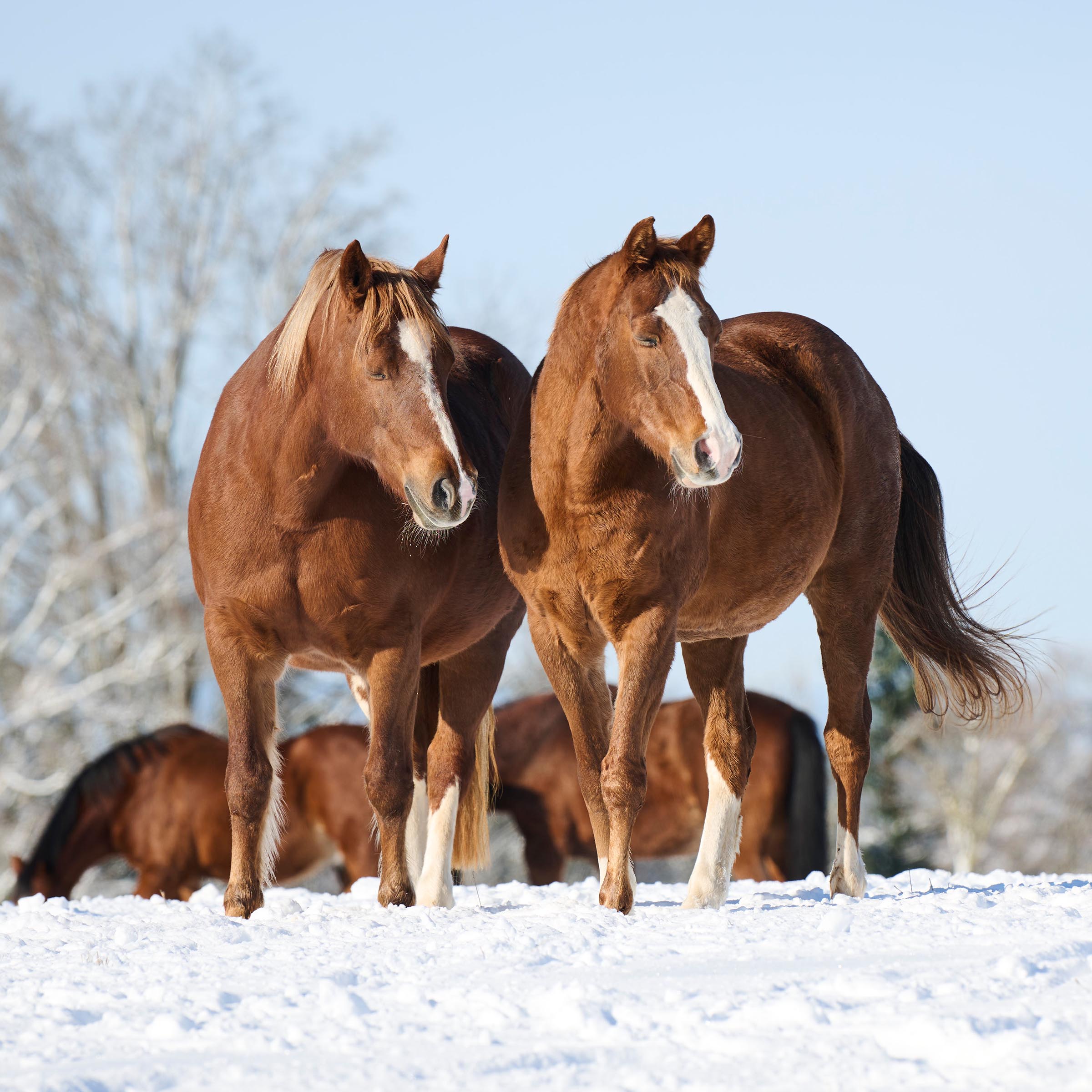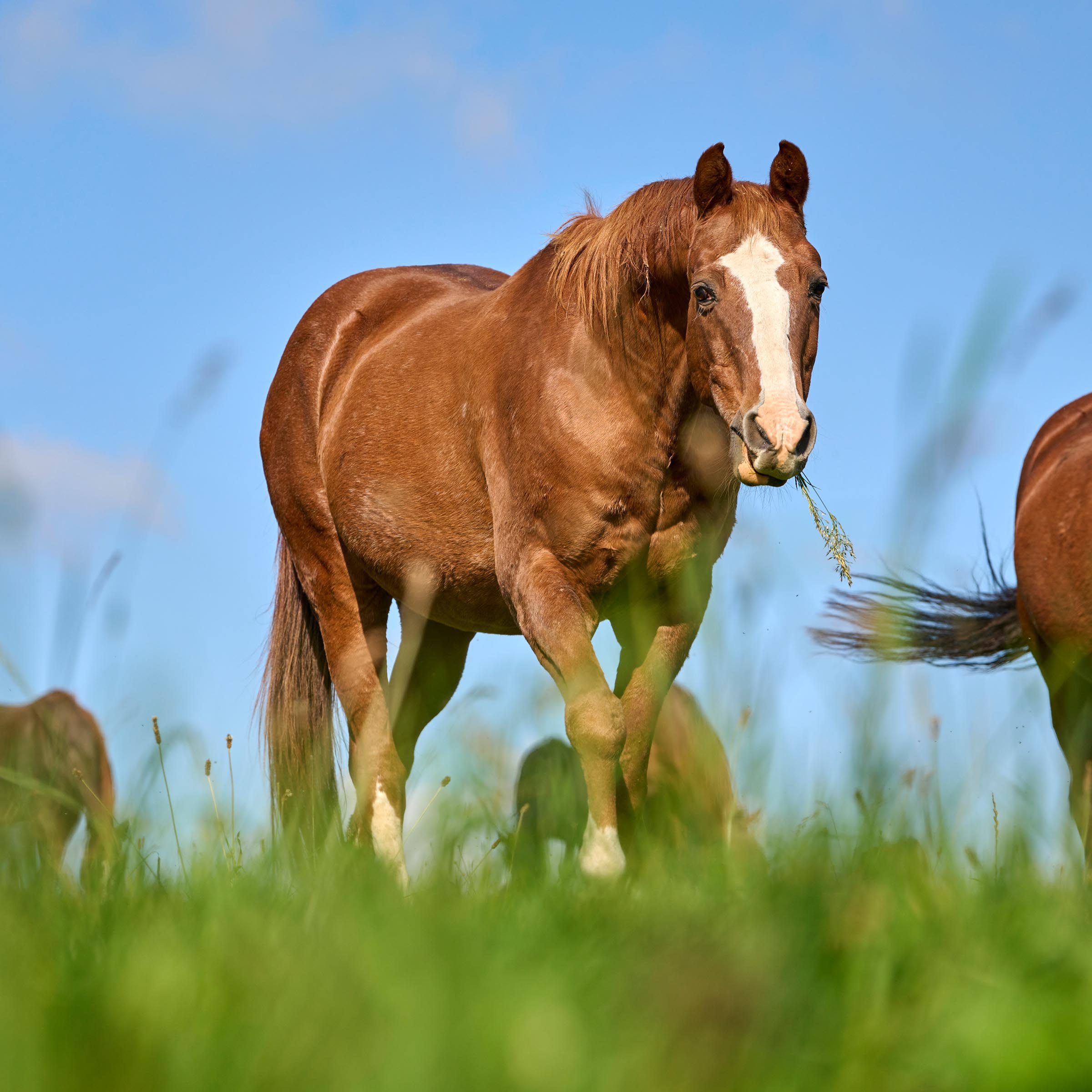 grosse weisse Blesse über den ganzen Kopf; drei weisse Stiefel (ausser vorne links)